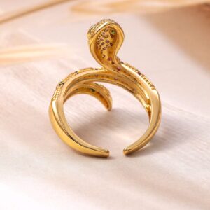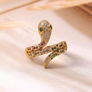 Ring : This captivating finger ring showcases an exotic snake motif, intricately designed with multi-colored stones and sparkling Cubic Zirconia. The 18K gold-plated adjustable band ensures a perfect fit, making this ring a striking statement piece that adds a touch of bold elegance to any ensemble. Occasion : Bring your style to a whole new level with this handcrafted piece of jewellery. When you’re celebrating a special Occasion : – a birthday, wedding, or personal milestone – this piece adds that extra something that makes us feel special and looking our best. Dimension : Size : Length : 7 cm, Width : 2 cm Material :Brass Net Weight: 3.99g Net qty: 1 Rings Care Label : It is advisable to avoid contact with water and organic chemicals i.e. perfume sprays. Store jewellery in airtight box. After use, wipe the jewellery with soft cotton cloth.