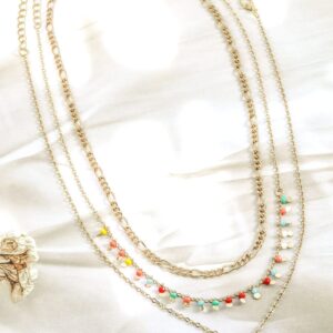 This 18K gold-plated multi-layered necklace from features colorful beads and a delicate star charm. Designed for a playful and trendy look, it adds a stylish touch to any outfit. Occasion : Bring your style to a whole new level with this handcrafted piece of jewellery. When you’re celebrating a special Occasion : – a birthday, wedding, or personal milestone – this piece adds that extra something that makes us feel special and looking our best. Material : & Care Dimension : Length Necklace – 21 cm & Earrings : 1 cm Material : Brass Care Label : It is advisable to avoid contact with water and organic chemicals i.e. perfume sprays. Store jewellery in airtight box. After use, wipe the jewellery with soft cotton cloth.