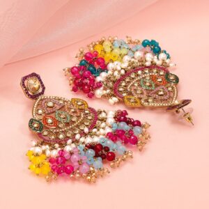 Elevate your traditional look with these dome-shaped 18K gold-plated long chandelier earrings. Highlighted with multicolor Kundan, pearls, and vibrant bead danglers, they bring elegance to every attire. Material & Care Length : 10 cm ; Width : 4 cm Material : Brass Care Label : It is advisable to avoid contact with water and organic chemicals i.e. perfume sprays. Store jewellery in airtight box. After use, wipe the jewellery with soft cotton cloth.