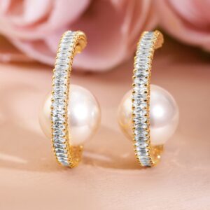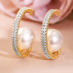 Earrings : Elevate your look with these 18K gold-plated half hoop earrings, featuring a central pearl stud surrounded by sparkling cubic zirconia accents. Perfect for timeless elegance. Occasion : Bring your style to a whole new level with this handcrafted piece of jewellery. When you’re celebrating a special Occasion : – a birthday, wedding, or personal milestone – this piece adds that extra something that makes us feel special and looking our best. Material : & Care Dimension : Length : 3 cm, Width: 2 w Net Weight: 9.80 g Net Quantity : 1 Pair Of Earrings Material :Brass Care Label : It is advisable to avoid contact with water and organic chemicals i.e. perfume sprays. Store jewellery in airtight box. After use, wipe the jewellery with soft cotton cloth.