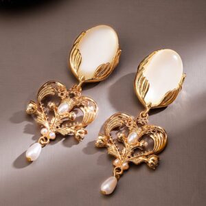 Earrings : Exquisitely designed 18K gold-plated dangler earrings with a vintage filigree pattern, adorned with elegant pearl detailing. The intricate craftsmanship and pearl embellishments make these earrings a timeless statement piece for weddings, festive occasions, and special celebrations. Occasion : Bring your style to a whole new level with this handcrafted piece of jewellery. When you’re celebrating a special Occasion : – a birthday, wedding, or personal milestone – this piece adds that extra something that makes us feel special and looking our best. Material : & Care Dimension : Net Weight: 32.84 g Net Quantity : 1 Pair of Earrings Material :Brass Care Label : It is advisable to avoid contact with water and organic chemicals i.e. perfume sprays. Store jewellery in airtight box. After use, wipe the jewellery with soft cotton cloth.