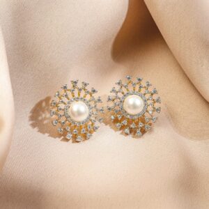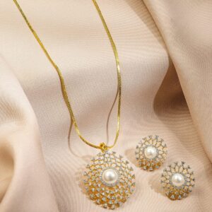 Pendent Set : This 18K Gold-Plated necklace set features a pearl-studded sunburst pendant with white cubic zirconia and matching earrings. A graceful classic for elegant festive and party wear. Occasion : Bring your style to a whole new level with this handcrafted piece of jewellery. When you’re celebrating a special Occasion : – a birthday, wedding, or personal milestone – this piece adds that extra something that makes us feel special and looking our best. Material : & Care Dimension : Length : 25.5 cm ; Earrings Length : 2.2 cm Necklace Width: 3.2 cm ; Earrings Width : 2 cm Plating : Gold Plated Net Quantity : 1 Necklace & 1 Pair of Earrings Net Weight: 14.42 g Material : Brass Care Label : It is advisable to avoid contact with water and organic chemicals i.e. perfume sprays. Store jewellery in airtight box. After use, wipe the jewellery with soft cotton cloth.