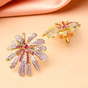 Earrings : Elevate your style with these 18K gold-plated floral-inspired stud earrings, featuring pink, red, and white cubic zirconia stones for a dazzling and luxurious look. Occasion : Bring your style to a whole new level with this handcrafted piece of jewellery. When you’re celebrating a special Occasion : – a birthday, wedding, or personal milestone – this piece adds that extra something that makes us feel special and looking our best. Material : & Care Dimension : Length : 3.5 cm, Width: 3.5 w Net Weight: 19.08 g Net Quantity : 1 Pair Of Earrings Material :Brass Care Label : It is advisable to avoid contact with water and organic chemicals i.e. perfume sprays. Store jewellery in airtight box. After use, wipe the jewellery with soft cotton cloth.
