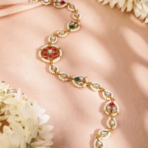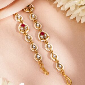 Head Jewellery : This 18K gold-plated matha patti features intricate red, green, and white Kundan details with pearl beads, perfect for a regal and elegant bridal or festive look. Occasion : Bring your style to a whole new level with this handcrafted piece of jewellery. When you’re celebrating a special Occasion : – a birthday, wedding, or personal milestone – this piece adds that extra something that makes us feel special and looking our best. Material : & Care Dimension : Length : 30 cm, Width: 2.3 cm Net Weight: 35.14 g Net Quantity : 1 Head Jewellery Material :Brass Care Label : It is advisable to avoid contact with water and organic chemicals i.e. perfume sprays. Store jewellery in airtight box. After use, wipe the jewellery with soft cotton cloth.