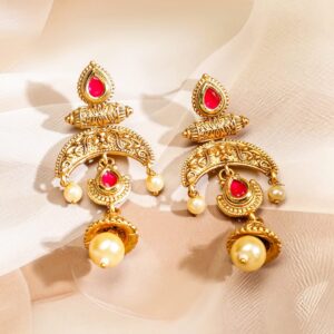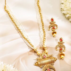This 22K gold-plated temple necklace set features intricate ruby and Kundan stone accents, paired with multistrand pearl beads. The set includes matching earrings for a regal traditional look. Occasion : Bring your style to a whole new level with this handcrafted piece of jewellery. When you’re celebrating a special Occasion : – a birthday, wedding, festive or personal milestone – this piece adds that extra something that makes us feel special and looking our best. Material & Care Dimension : Necklace – 61.9 cm ,Earrings- 8.5 cm Material : Brass Care Label : It is advisable to avoid contact with water and organic chemicals i.e. perfume sprays. Store jewellery in airtight box. After use, wipe the jewellery with soft cotton cloth