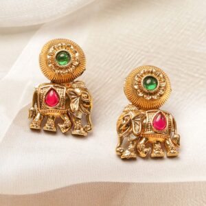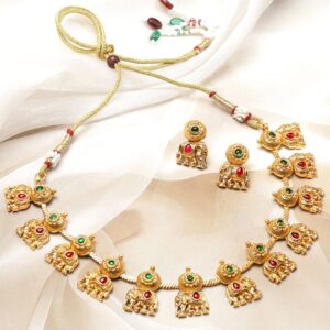 Necklace Set: This 22K gold-plated temple necklace set in high-quality brass features heritage-inspired elephant motifs adorned with ruby red and emerald green stones, offering a regal and traditional appeal ideal for festive and bridal wear. Occasion Suitability: Perfect for bridal celebrations, festive pujas, or traditional gatherings, this temple-style jewellery adds a regal and spiritual essence to sarees and ethnic ensembles. Material & Care Dimension : Length : Necklace : 10 cm Earrings : 2 cm Width : Necklace : 3 cm Earrings : 1 cm Material: Brass Net Weight: 18.68 Gram Net Quantity: 1 Necklace & 1 Pair of Earrings Care Label: It is advisable to avoid contact with water and organic chemicals i.e. perfume sprays. Store jewellery in airtight box. After use, wipe the jewellery with soft cotton cloth.