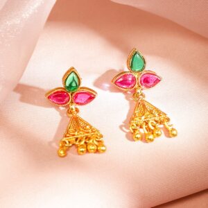 Be the first to review “18K Gold-Plated Ruby Pink & Emerald Green Studded Temple Design Necklace Set with Golden Bead Accents for Women”