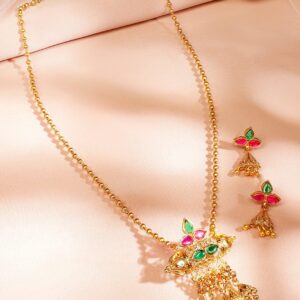 Jewellery Set : A 18K gold-plated handcrafted temple necklace set, adorned with ruby pink and emerald green stones with golden bead accents. Designed for women, perfect for weddings, festive occasions & traditional ceremonies. Occasion : Bring your style to a whole new level with this handcrafted piece of jewelry. When you’re celebrating a weddings, festive occasions & traditional ceremonies, this piece adds that extra something that makes us feel special and looking our best. Material & Care Dimension : Length Size : Necklace : 28 cm, Earrings : 4 cm Dimension : Width : Necklace : 3 cm, Earrings : 1.5 cm Net Quantity : 1 Necklace & 1 Pair of Earrings Net Weight: 20.96 g Material : Brass Care Label : It is advisable to avoid contact with water and organic chemicals i.e. perfume sprays. Store jewellery in airtight box. After use, wipe the jewellery with soft cotton cloth.
