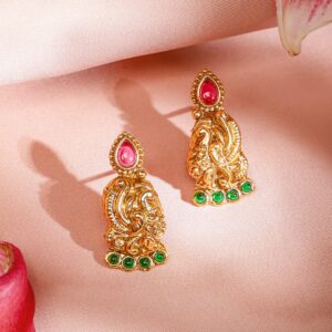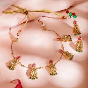 Jewellery Set : This 18K gold-plated temple necklace set features intricately carved peacock and floral motifs, studded with ruby pink and emerald green stones—ideal for festive and traditional occasions for women & girls. Occasion : Bring your style to a whole new level with this handcrafted piece of jewelry. When you’re celebrating a weddings, festive occasions & traditional ceremonies, this piece adds that extra something that makes us feel special and looking our best. Material & Care Dimension : Length Size : Necklace : 22 cm, Earrings : 3 cm Dimension : Width : Necklace : 1.5 cm, Earrings : 1.5 cm Net Quantity : 1 Necklace & 1 Pair of Earrings Net Weight: 40.26 Gram Material : Brass Care Label : It is advisable to avoid contact with water and organic chemicals i.e. perfume sprays. Store jewellery in airtight box. After use, wipe the jewellery with soft cotton cloth.