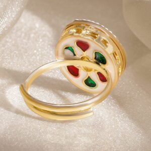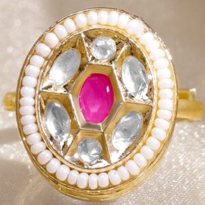 Ring: This luxurious 18K gold-plated ring features a ruby pink stone at the center, encircled by kundan and delicate pearl accents. Crafted in brass, its adjustable fit ensures elegance and comfort, ideal for festive and wedding looks. Occasion & Styling: Ideal for weddings, festivals, and ethnic celebrations, this ring complements lehengas, sarees, and traditional outfits, making it a versatile and festive must-have accessory. Material : & Care Dimension :Size : Adjustable Material: Brass Net Weight: 6.35 Gram Net Quantity: 1 Ring Care Label: It is advisable to avoid contact with water and organic chemicals i.e. perfume sprays. Store jewellery in airtight box. After use, wipe the jewellery with soft cotton cloth.