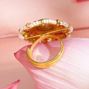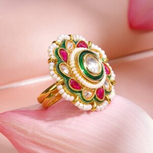 Ring: This 18K gold-plated floral adjustable ring features ruby pink and white kundan stones with green enamel and pearl beading—ideal for bridal wear, festive styling, and ethnic celebrations. Perfect for Celebrations: Whether it’s for bridal wear, festive occasions, or cultural events, this statement ring complements sarees, lehengas, and traditional outfits with elegance and radiance. Material : & Care Dimension :Size : Adjustable Material: Brass Net Weight: 7.88 Gram Net Quantity: 1 Ring Care Label: It is advisable to avoid contact with water and organic chemicals i.e. perfume sprays. Store jewellery in airtight box. After use, wipe the jewellery with soft cotton cloth.