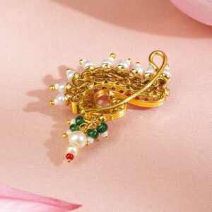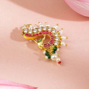 This18K gold-plated peacock-shaped Nath is embellished with ruby pink and white stones, pearls, and green enamel drops—crafted to elevate bridal and festive looks with statement charm. Cultural Grace & Gifting: A symbolic and stylish gift for brides or festive celebrations. This floral Nath brings timeless cultural grace to every traditional jewellery collection. Material & Care Dimension: Length: 4 cm ; Width: 2 cm Material: Brass Net Weight: 4.20 Gram Net Quantity: 1 Nath Nosepin Care Label: It is advisable to avoid contact with water and organic chemicals i.e. perfume sprays. Store jewellery in airtight box. After use, wipe the jewellery with soft cotton cloth.