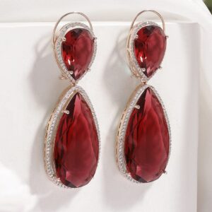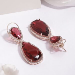 Earrings : 18K gold-plated drop earrings with ruby red stones and cubic zirconia accents. Elegant and stylish, perfect for adding luxury and sparkle to any outfit. Occasion : Bring your style to a whole new level with this handcrafted piece of jewellery. When you’re celebrating a special Occasion : – a birthday, wedding, or personal milestone – this piece adds that extra something that makes us feel special and looking our best. Material : & Care Dimension : Length : 7cm, Width: 2.5cm Material: Alloy Net Weight: 37.65 Gram Net Quantity: 1 Pair of Earrings Care Label: It is advisable to avoid contact with water and organic chemicals i.e. perfume sprays. Store jewellery in airtight box. After use, wipe the jewellery with soft cotton cloth.