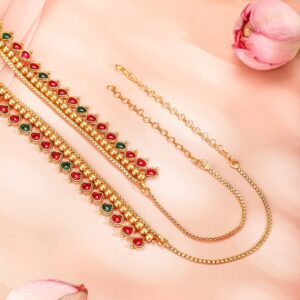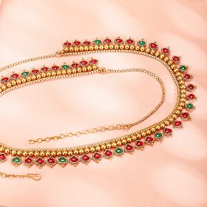 Saree Accessories : Elevate your traditional look with this 18K gold-plated kamarbandh. Featuring a delicate arrangement of ruby red and emerald green stones, this handcrafted piece is adorned with golden beads and intricate detailing. Perfect for enhancing ethnic and festive ensembles. Occasion : Bring your style to a whole new level with this handcrafted piece of jewellery. When you’re celebrating a special Occasion : – a birthday, wedding, or personal milestone – this piece adds that extra something that makes us feel special and looking our best. Material : & Care Dimension : Length : 52 cm, Width: 2 cm Net Weight: 68 g Net Quantity : 1 Saree Accessories Material :Brass Care Label : It is advisable to avoid contact with water and organic chemicals i.e. perfume sprays. Store jewellery in airtight box. After use, wipe the jewellery with soft cotton cloth.