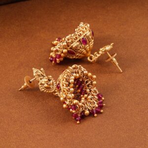 Earrings : These 18K gold-plated jhumka earrings feature intricate Ganesha motifs, ruby stones, and dangling red beads. A traditional design that adds divine elegance to your festive or bridal look. Occasion : Bring your style to a whole new level with this handcrafted piece of jewellery. When you’re celebrating a special Occasion : – a birthday, festive, wedding or personal milestone – this piece adds that extra something that makes us feel special and looking our best. Material : & Care Dimension : Length : 5.2 cm, Width: 2.5 cm Material :Brass Care Label : It is advisable to avoid contact with water and organic chemicals i.e. perfume sprays. Store jewellery in airtight box. After use, wipe the jewellery with soft cotton cloth.