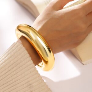 Bracelet : 18K gold-plated cuff bangle exudes modern luxury with its sleek, sculptural design. Its high-polish finish adds a statement-worthy shine, making it a must-have for effortless elegance. Occasion : Bring your style to a whole new level with this handcrafted piece of jewellery. When you’re celebrating a special Occasion : – a birthday, wedding, or personal milestone – this piece adds that extra something that makes us feel special and looking our best. Material : & Care Dimension : Length : 7.5 cm, Width: 3.5 cm Net Weight: 20.50g Net Quantity : 1 Bracelet Material :Brass Care Label : It is advisable to avoid contact with water and organic chemicals i.e. perfume sprays. Store jewellery in airtight box. After use, wipe the jewellery with soft cotton cloth.
