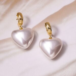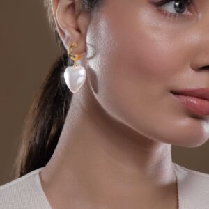 Earrings : These drop earrings feature a charming heart-shaped white pearl suspended from a sleek 18K gold plated hoop. The smooth, lustrous finish of the pearl contrasts beautifully with the warm gold, creating a timeless and elegant look. Perfect for adding a touch of sophistication to any outfit. Occasion : Bring your style to a whole new level with this handcrafted piece of jewellery. When you’re celebrating a special Occasion : – a birthday, wedding, or personal milestone – this piece adds that extra something that makes us feel special and looking our best. Material : & Care Dimension : Size : Length : 4.5 cm, Width : 2.5 cm Material :Brass Net Weight : 8.94g Net Qty : 1 Pair Care Label : It is advisable to avoid contact with water and organic chemicals i.e. perfume sprays. Store jewellery in airtight box. After use, wipe the jewellery with soft cotton cloth.