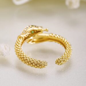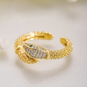 Ring : This bold and luxurious adjustable ring is crafted in 18K gold plating, featuring a striking snake design. The head of the snake is encrusted with dazzling cubic zirconia stones, accented with a green gemstone eye for a touch of elegance. The intricate scale detailing adds texture, making this ring a statement piece perfect for those who love unique and edgy jewelry. Occasion : Bring your style to a whole new level with this handcrafted piece of jewellery. When you’re celebrating a special Occasion : – a birthday, wedding, or personal milestone – this piece adds that extra something that makes us feel special and looking our best. Material : & Care Dimension : Size : Length : 5.46 cm Material :Brass Net Weight: 9.1 Gram Net Quantity: 1 Ring Care Label : It is advisable to avoid contact with water and organic chemicals i.e. perfume sprays. Store jewellery in airtight box. After use, wipe the jewellery with soft cotton cloth.