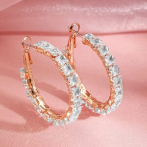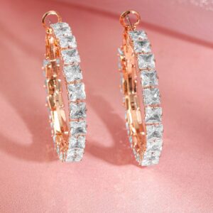 Earrings : 18K Gold-plated hoop earrings studded with square-cut cubic zirconia, a bold accessory for a dazzling look. Occasion : Bring your style to a whole new level with this handcrafted piece of jewellery. When you’re celebrating a special Occasion : – a birthday, wedding, or personal milestone – this piece adds that extra something that makes us feel special and looking our best. Material : & Care Dimension : Length : 3.2 cm, Width: 3.5 cm Net Weight: 9 g Net Quantity : 1 Pair Of Earrings Material :Brass Care Label : It is advisable to avoid contact with water and organic chemicals i.e. perfume sprays. Store jewellery in airtight box. After use, wipe the jewellery with soft cotton cloth.