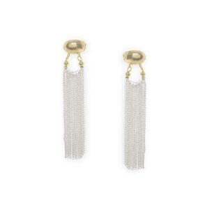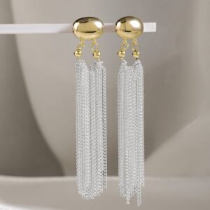 Make a statement with 18K gold plated long drop earrings. Featuring elegant silver chain tassels and a sleek, waterproof design, these earrings are perfect for stylish looks. Occasion : Bring your style to a whole new level with this handcrafted piece of jewellery. When you’re celebrating a special Occasion : – a birthday, wedding, or personal milestone – this piece adds that extra something that makes us feel special and looking our best. Material : & Care Dimension :Size: 18 cm Material :Stainless Steel Care Label : It is advisable to avoid contact with water and organic chemicals i.e. perfume sprays. Store jewellery in airtight box. After use, wipe the jewellery with soft cotton cloth.