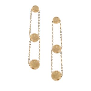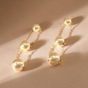 Make a bold statement with 18K gold plated dangle earrings featuring triple ball detailing and chain design. Crafted from stainless steel, these earrings are tarnish-free and waterproof. Material & Care Dimension : Length 7 cm Material : Stainless Steel Net Quantity : 1 Pair of Earrings Care Label : It is advisable to avoid contact with water and organic chemicals i.e. perfume sprays. Store jewellery in airtight box. After use, wipe the jewellery with soft cotton cloth.