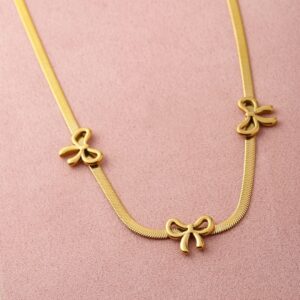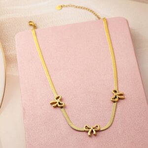 Adorn your neckline with the delicate elegance of this 18K gold-plated necklace. Crafted from premium stainless steel, this piece is tarnish-free and waterproof, offering durability without compromising on style. The necklace features charming bow designs, adding a touch of playful sophistication to your look. Perfect for both everyday wear and special occasions, this necklace is a versatile addition to any jewelry collection. Elevate your style effortlessly with this beautiful piece from . Material: Wipe with a clean, dry cloth to remove dust Size : Length : 38 cm, Width : 1.5 cm