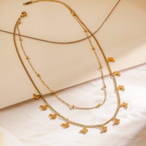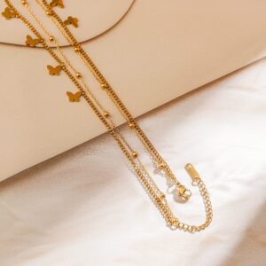 Chain & Necklace : This elegant layered necklace features 18K gold plating on stainless steel, adorned with delicate butterfly charms, offering a tarnish-free and waterproof finish for lasting shine. Occasion : Bring your style to a whole new level with this handcrafted piece of jewellery. When you’re celebrating a special Occasion : – a birthday, wedding, or personal milestone – this piece adds that extra something that makes us feel special and looking our best. Material : & Care Dimension : Size : Length : 20 cm, Width : 0.8 cm Net Weight: 8.65 g Net Quantity : 1 Chain & Necklace Material :Stainless Steel Care Label : It is advisable to avoid contact with water and organic chemicals i.e. perfume sprays. Store jewellery in airtight box. After use, wipe the jewellery with soft cotton cloth.