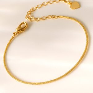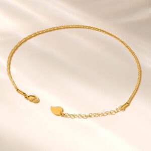 Anklet : 18K gold-plated stainless steel anklet with a classic minimal chain design, tarnish-free, waterproof, and adjustable for all-day comfort. Perfect for daily, office, festive, and casual wear. Versatile Styling: Ideal for daily, office, festive, or casual outings, this classic anklet complements both traditional and modern outfits effortlessly. Material : & Care Dimension : Size : Length : 21 cm, Width : 1 cm Net Weight : 2 Gram Material : Stainless Steel Net Quantity : 1 Anklets Care Label : It is advisable to avoid contact with water and organic chemicals i.e. perfume sprays. Store jewellery in airtight box. After use, wipe the jewellery with soft cotton cloth.