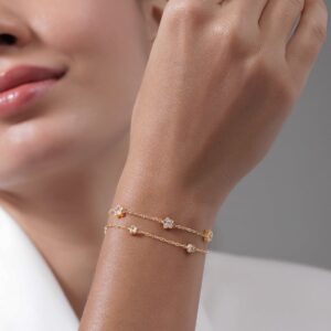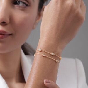 Bracelet : This bracelet is a beautiful double-layered design, crafted with 18K gold-plated stainless steel, ensuring it’s tarnish-free and waterproof. Adorned with sparkling CZ stones in star-shaped settings, this bracelet adds a touch of elegance and charm to any outfit, perfect for versatile styling. Occasion : Bring your style to a whole new level with this handcrafted piece of jewellery. When you’re celebrating a special Occasion : – a birthday, wedding, or personal milestone – this piece adds that extra something that makes us feel special and looking our best. Material : & Care Dimension : Size : Length : 16 cm, Width : 0.5 cm Material :Stainless steel Care Label : It is advisable to avoid contact with water and organic chemicals i.e. perfume sprays. Store jewellery in airtight box. After use, wipe the jewellery with soft cotton cloth.