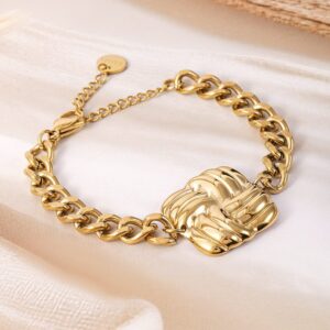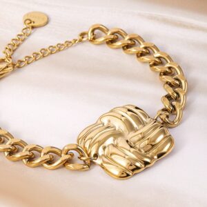 Bracelet : This 18K gold-plated bracelet features a chunky chain design with a bold, textured central knot. Crafted from tarnish-free and waterproof stainless steel, this bracelet offers both durability and style. The luxurious gold tone and unique design make it a statement piece perfect for any fashion-forward accessory collection. Occasion : Bring your style to a whole new level with this handcrafted piece of jewellery. When you’re celebrating a special Occasion : – a birthday, wedding, or personal milestone – this piece adds that extra something that makes us feel special and looking our best. Material : & Care Dimension : Size : Length : 15 cm, Width : 1.5 cm Material :Brass Care Label : It is advisable to avoid contact with water and organic chemicals i.e. perfume sprays. Store jewellery in airtight box. After use, wipe the jewellery with soft cotton cloth.