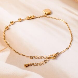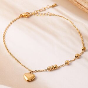Anklet : This lovely anklet features a dainty heart charm, crafted in 18K gold-plated stainless steel. The design includes delicate beads and is tarnish-free and waterproof, making it a perfect everyday accessory that combines elegance and durability. Occasion : Bring your style to a whole new level with this handcrafted piece of jewellery. When you’re celebrating a special Occasion : – a birthday, wedding, or personal milestone – this piece adds that extra something that makes us feel special and looking our best. Material : & Care Dimension : Size : Length : 22 cm, Width : 1 cm Material :Stainless Steel Care Label : It is advisable to avoid contact with water and organic chemicals i.e. perfume sprays. Store jewellery in airtight box. After use, wipe the jewellery with soft cotton cloth.