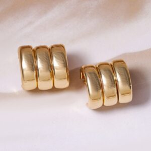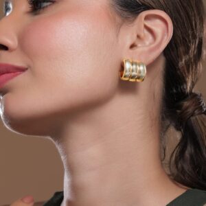 Earrings : These 18K gold-plated huggie hoop earrings feature a modern triple-band design with a sleek, polished finish. The bold yet minimalist style makes them a versatile accessory, perfect for adding a touch of sophistication to any outfit. Occasion : Bring your style to a whole new level with this handcrafted piece of jewellery. When you’re celebrating a special Occasion : – a birthday, wedding, or personal milestone – this piece adds that extra something that makes us feel special and looking our best. Material : & Care Dimension : Size : Length : 1.7 cm, Width : 1.7 cm Material :Brass Care Label : It is advisable to avoid contact with water and organic chemicals i.e. perfume sprays. Store jewellery in airtight box. After use, wipe the jewellery with soft cotton cloth.