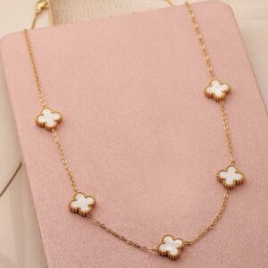 Elevate your style with the 18K gold-plated necklace, meticulously crafted from premium stainless steel. This tarnish-free and waterproof necklace features a delicate clover flora motif, symbolizing luck and elegance. The minimalist design ensures versatility, making it a chic accessory for any occasion. Durable and luxurious, this necklace combines timeless beauty with everyday practicality, perfect for the modern woman who values both style and quality. Material: Wipe with a clean, dry cloth to remove dust Size : Length : 46 cm, Width : 1.3 cm Net Weight : 8.79g Net Qty : 1 Necklace