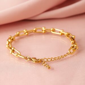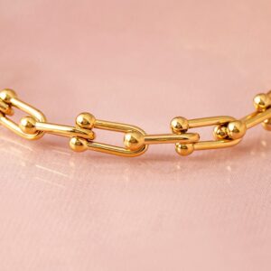 Elevate your wrist game with this 18K gold-plated link bracelet, meticulously crafted from high-quality stainless steel. Designed to be tarnish-free and waterproof, this bracelet offers both style and durability, ensuring it remains a staple in your collection for years to come. The intricate link design, combined with the luxurious gold plating, makes this bracelet a perfect addition to any outfit, whether for casual or formal occasions. Add a touch of elegance and sophistication to your look with this timeless piece. Material: Wipe with a clean, dry cloth to remove dust Size : Length : 17 cm, Width : 0.6 cm