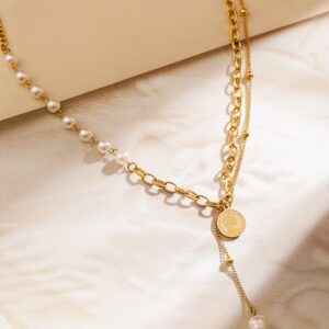 18K Gold-Plated Stainless Steel Tarnish-Free Waterproof Pearl & Coin Chain Necklace – Gold