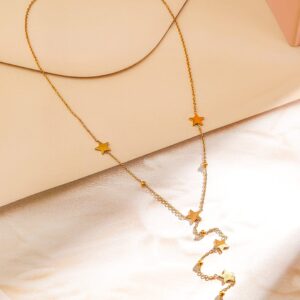 Chain & Necklace : This delicate layered necklace features 18K gold plating on stainless steel, adorned with star charms, making it a tarnish-free and waterproof piece perfect for modern elegance. Occasion : Bring your style to a whole new level with this handcrafted piece of jewellery. When you’re celebrating a special Occasion : – a birthday, wedding, or personal milestone – this piece adds that extra something that makes us feel special and looking our best. Material : & Care Dimension : Size : Length : 31 cm, Width : 0.8 cm Net Weight: 3.729 g Net Quantity : 1 Chain & Necklace Material :Stainless Steel Care Label : It is advisable to avoid contact with water and organic chemicals i.e. perfume sprays. Store jewellery in airtight box. After use, wipe the jewellery with soft cotton cloth.