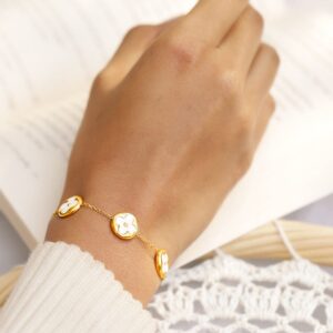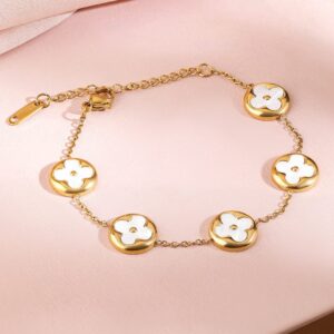 Bracelet : This 18K gold-plated bracelet features elegant white clover charms symbolizing luck and grace. Crafted from stainless steel, it is tarnish-free and waterproof, ensuring a luxurious and durable finish. Occasion : Bring your style to a whole new level with this handcrafted piece of jewellery. When you’re celebrating a special Occasion : – a birthday, wedding, or personal milestone – this piece adds that extra something that makes us feel special and looking our best. Material : & Care Dimension : Size : Length : 16 cm, Width : 1.2 cm Net Weight: 9.80 g Net Quantity : 1 Bracelet Material :Stainless Steel Care Label : It is advisable to avoid contact with water and organic chemicals i.e. perfume sprays. Store jewellery in airtight box. After use, wipe the jewellery with soft cotton cloth.
