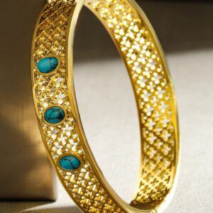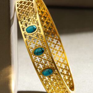 Bracelet : A stunning filigree bracelet in 18K gold plating, studded with oval-cut blue stones, crafted from stainless steel for a tarnish-free, waterproof, and long-lasting shine. Occasion : Bring your style to a whole new level with this handcrafted piece of jewellery. When you’re celebrating a special Occasion : – a birthday, wedding, or personal milestone – this piece adds that extra something that makes us feel special and looking our best. Material : & Care Dimension : Length : 6 cm, Width: 1.1 cm Net Weight: 27.2g Net Quantity : 1 Bracelet Material :Stainless steel Care Label : It is advisable to avoid contact with water and organic chemicals i.e. perfume sprays. Store jewellery in airtight box. After use, wipe the jewellery with soft cotton cloth.
