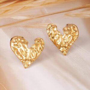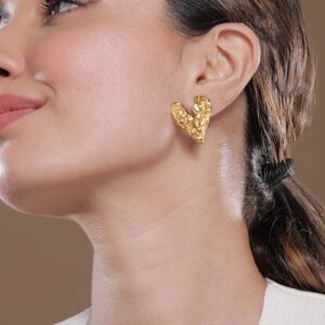 Earrings : Discover the elegance of 18K Gold Plated StainlessSteel Tarnish-Free Waterproof Textured Heart Stud Earrings. This piece combines quality craftsmanship with a timeless design, making it perfect for any occasion. Elevate your style effortlessly and enjoy compliments on your refined taste. A must-have addition to your jewelry collection. Occasion : Bring your style to a whole new level with this handcrafted piece of jewellery. When you’re celebrating a special Occasion : – a birthday, wedding, or personal milestone – this piece adds that extra something that makes us feel special and looking our best. Material : & Care Dimension : Earrings Size :Length : 3.5 cm, Width : 2.5 cm Material :Stainless steel Care Label : It is advisable to avoid contact with water and organic chemicals i.e. perfume sprays. Store jewellery in airtight box. After use, wipe the jewellery with soft cotton cloth.