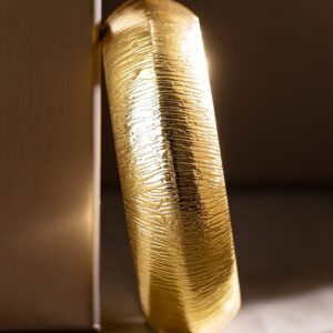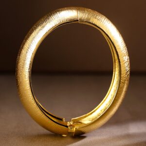 Bracelet : This 18K gold-plated bold statement bangle features a rich textured finish, offering a luxurious and sophisticated look. The openable design ensures a secure and comfortable fit. Occasion : Bring your style to a whole new level with this handcrafted piece of jewellery. When you’re celebrating a special Occasion : – a birthday, wedding, or personal milestone – this piece adds that extra something that makes us feel special and looking our best. Material : & Care Dimension : Length : 2.6 cm, Width: 3.2 cm Net Weight: 70.40 g Net Quantity : 1 Bracelet Material :Brass Care Label : It is advisable to avoid contact with water and organic chemicals i.e. perfume sprays. Store jewellery in airtight box. After use, wipe the jewellery with soft cotton cloth.