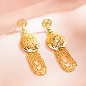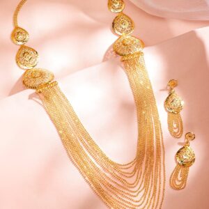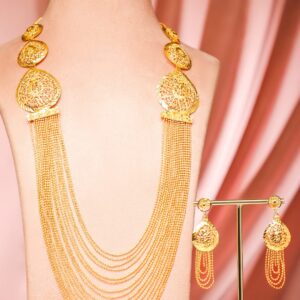 Jewellery Set : This 18K gold-plated necklace set features textured disc motifs with multi-layered gold bead chains and matching earrings—perfect for festive and party occasions for women & girls. Occasion : Bring your style to a whole new level with this handcrafted piece of jewelry. When you’re celebrating a weddings, festive occasions & traditional ceremonies, this piece adds that extra something that makes us feel special and looking our best. Material & Care Dimension : Length Size : Necklace : 78 cm, Earrings : 4 cm Dimension : Width : Necklace : 5 cm, Earrings : 4 cm Net Quantity : 1 Necklace & 1 Pair of Earrings Net Weight: 52.78 Gram Material : Brass Care Label : It is advisable to avoid contact with water and organic chemicals i.e. perfume sprays. Store jewellery in airtight box. After use, wipe the jewellery with soft cotton cloth.
