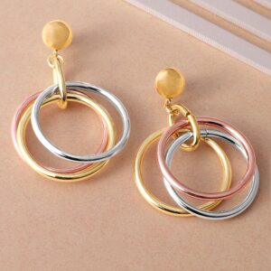 18K gold-plated triple-tone hoop earrings featuring interlocking rings in gold, silver, and copper tones. A contemporary circular design that adds a touch of style to any look. Material & Care Dimension : Length : 4.5 cm ; Width : 2.5 cm Material : Brass Care Label : It is advisable to avoid contact with water and organic chemicals i.e. perfume sprays. Store jewellery in airtight box. After use, wipe the jewellery with soft cotton cloth.