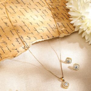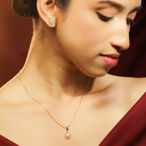 Pendent Set : This elegant pendant set features a circular white cubic zirconia-studded design with matching earrings, beautifully plated in 18K gold for a graceful festive and special occasion look. Occasion : Bring your style to a whole new level with this handcrafted piece of jewellery. When you’re celebrating a special Occasion : – a birthday, wedding, or personal milestone – this piece adds that extra something that makes us feel special and looking our best. Material : & Care Dimension : Length : 24 cm ; Earrings Length : 1 cm Necklace Width: 1 cm ; Earrings Width : 1 cm Plating : Gold Plated Net Quantity : 1 Pendent & 1 Pair of Earrings Net Weight: 7.10 Gram Material : Brass Care Label : It is advisable to avoid contact with water and organic chemicals i.e. perfume sprays. Store jewellery in airtight box. After use, wipe the jewellery with soft cotton cloth.
