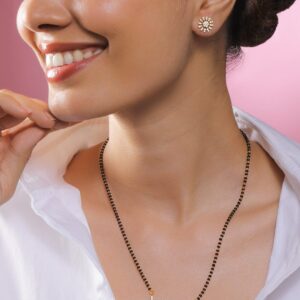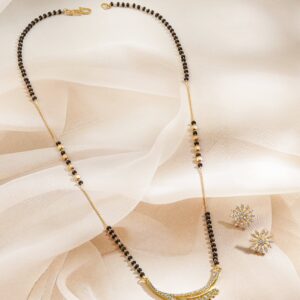 Be the first to review “18K Gold-Plated White Cubic Zirconia Studded Crescent Moon Mangalsutra Set with Black Beaded Chain & Floral Earrings – Gold”
