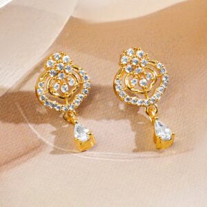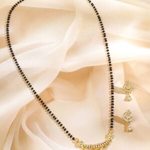Mangalsutra Set : This 18K Gold-Plated mangalsutra set features a curved bar-style pendant studded with white cubic zirconia, teardrop dangler, black beaded chain, and matching earrings — a perfect blend of elegance and tradition. Occasion : Bring your style to a whole new level with this handcrafted piece of jewelry. When you’re celebrating a daily minimal, weddings, festive occasions & traditional ceremonies, this piece adds that extra something that makes us feel special and looking our best. Material & Care Dimension : Length Size : Necklace : 22 cm ; Earrings : 0.6 Dimension : Width : Necklace : 1.5 cm ; Earrings : 1 cm Net Quantity : 1 Necklace & 1 Pair of Earrings Net Weight: 10.50 g Material : Brass Care Label : It is advisable to avoid contact with water and organic chemicals i.e. perfume sprays. Store jewellery in airtight box. After use, wipe the jewellery with soft cotton cloth.