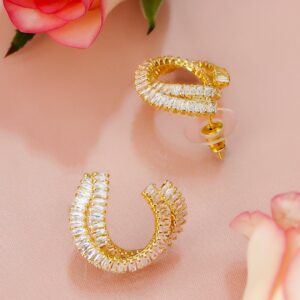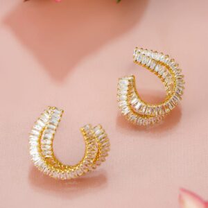 Earrings : These 18K Gold-plated spiral design stud earrings feature dazzling white cubic zirconia arranged in a layered curve, offering bold elegance with a modern edge. A perfect party statement. Perfect for Parties: Designed to dazzle, these studs are ideal for parties, evening galas, or special occasions. Their structured shape and sparkle instantly elevate modern western and indo-fusion outfits. Material : & Care Dimension : Length : 2.5 cm ; Width : 1 cm Net Weight : 18 Gram Material : Brass Net Quantity : 1 Pair of Earrings Care Label : It is advisable to avoid contact with water and organic chemicals i.e. perfume sprays. Store jewellery in airtight box. After use, wipe the jewellery with soft cotton cloth.