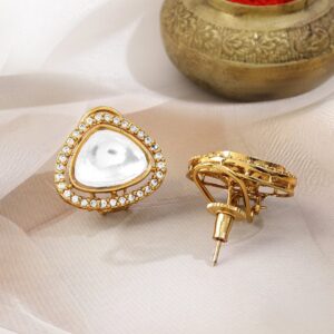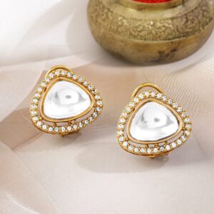 Earrings : These 18K gold-plated stud earrings feature a white Kundan triangle centerpiece framed by dazzling cubic zirconia. A graceful fusion of tradition and sparkle for women & girls for festive and traditional wear. Occasion : Bring your style to a whole new level with this handcrafted piece of jewellery. When you’re celebrating a special Occasion : – a birthday, festive or personal milestone – this piece adds that extra something that makes us feel special and looking our best. Material & Care Dimension : Length : 3 cm, Width: 3 w Net Weight: 48.30 Gram Plating : Gold Plated Net Quantity : 1 Pair Of Earrings Material : Brass Care Label : It is advisable to avoid contact with water and organic chemicals i.e. perfume sprays. Store jewellery in airtight box. After use, wipe the jewellery with soft cotton cloth.