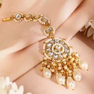 Head Jewellery : This 18K gold-plated maang tikka features intricate Kundan detailing with elegant pearl bead drops, making it a perfect accessory for a regal bridal or festive look. Occasion : Bring your style to a whole new level with this handcrafted piece of jewellery. When you’re celebrating a special Occasion : – a birthday, wedding, or personal milestone – this piece adds that extra something that makes us feel special and looking our best. Material : & Care Dimension : Length : 14 cm, Width: 8 w Net Weight: 14.72 g Net Quantity : 1 Head Jewellery Material :Brass Care Label : It is advisable to avoid contact with water and organic chemicals i.e. perfume sprays. Store jewellery in airtight box. After use, wipe the jewellery with soft cotton cloth.