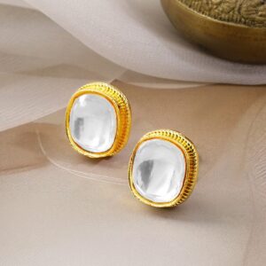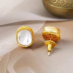 Earrings : These 18K gold-plated stud earrings feature bold square-shaped white Kundan stones in a sleek traditional frame. A timeless piece for women & girls—perfect for festive and traditional styling. Occasion : Bring your style to a whole new level with this handcrafted piece of jewellery. When you’re celebrating a special Occasion : – a birthday, festive or personal milestone – this piece adds that extra something that makes us feel special and looking our best. Material & Care Dimension : Length : 1.5 cm, Width: 1.5 w Net Weight: 48.30 Gram Plating : Gold Plated Net Quantity : 1 Pair Of Earrings Material : Brass Care Label : It is advisable to avoid contact with water and organic chemicals i.e. perfume sprays. Store jewellery in airtight box. After use, wipe the jewellery with soft cotton cloth.
