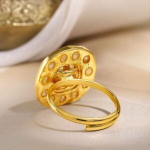 This 18K gold-plated adjustable ring features a round layout with a bold white Kundan centerpiece encircled by smaller Kundan stones. A timeless traditional statement for women & girls during festive celebrations. Occasion : Bring your style to a whole new level with this handcrafted piece of jewellery. When you’re celebrating a special Occasion : – a birthday, wedding, festive or personal milestone – this piece adds that extra something that makes us feel special and looking our best. Material : & Care Dimension :Adjustable Collection : Kundan Material: Brass Net Weight: 25 Gram Net Quantity: 1 Ring Care Label: It is advisable to avoid contact with water and organic chemicals i.e. perfume sprays. Store jewellery in airtight box. After use, wipe the jewellery with soft cotton cloth.